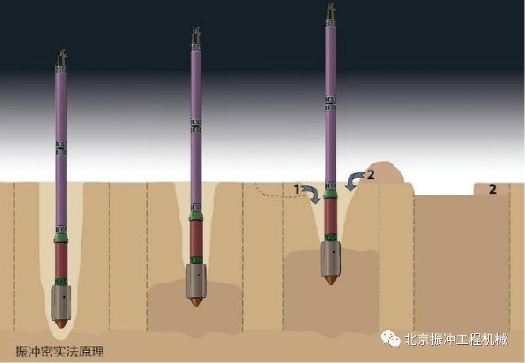 振冲挤密法一方面依靠振冲器的强力振动使饱和砂层发生液化,颗粒重新排列,孔隙比减少;另一方面依靠振冲器的水平振动力,形成垂直孔洞,在其中加入回填料,使砂层挤压密实。