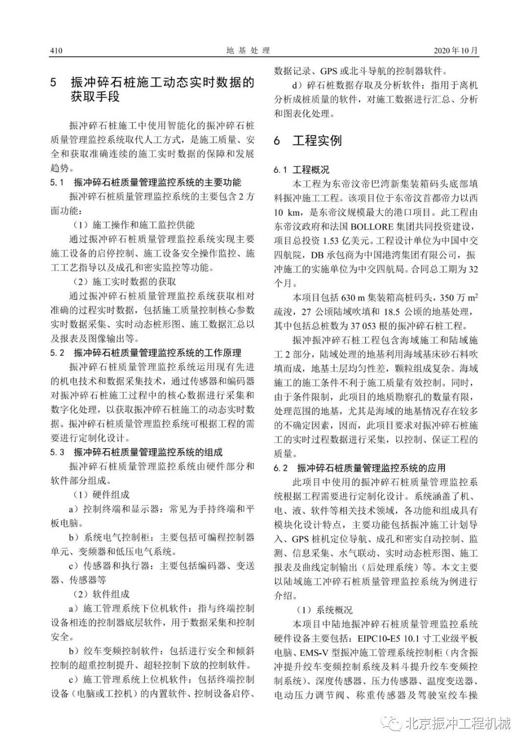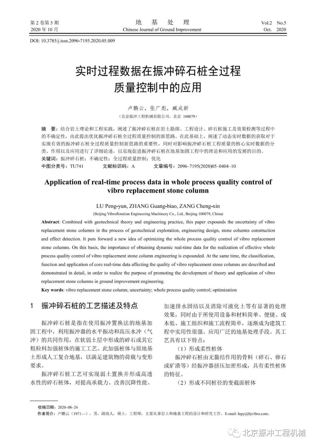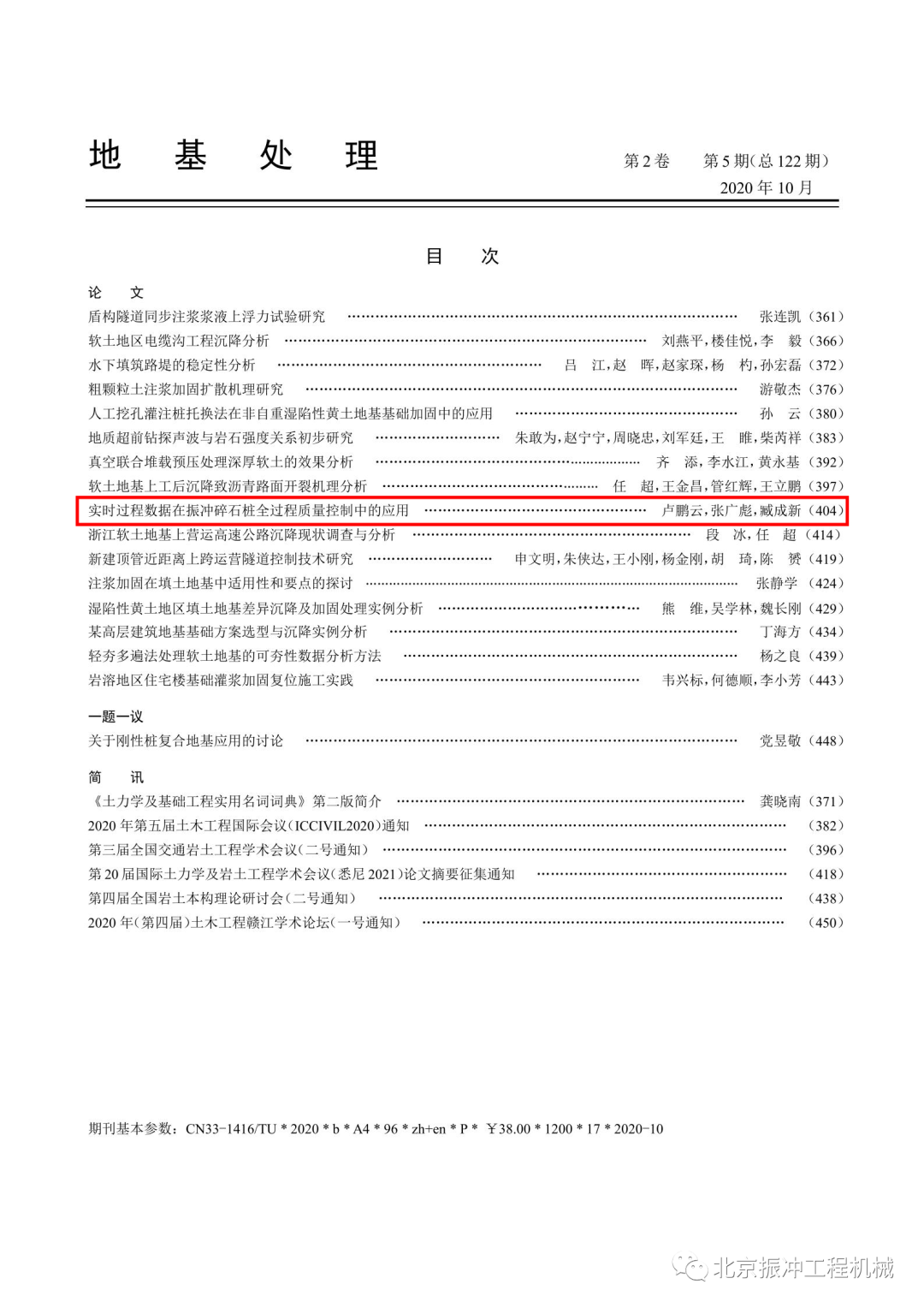 2020年10月,由北京振冲工程机械主编的《实时过程数据在振冲碎石桩全过程质量控制中的应用》在浙江大学主办的《地基处理》期刊上发表。