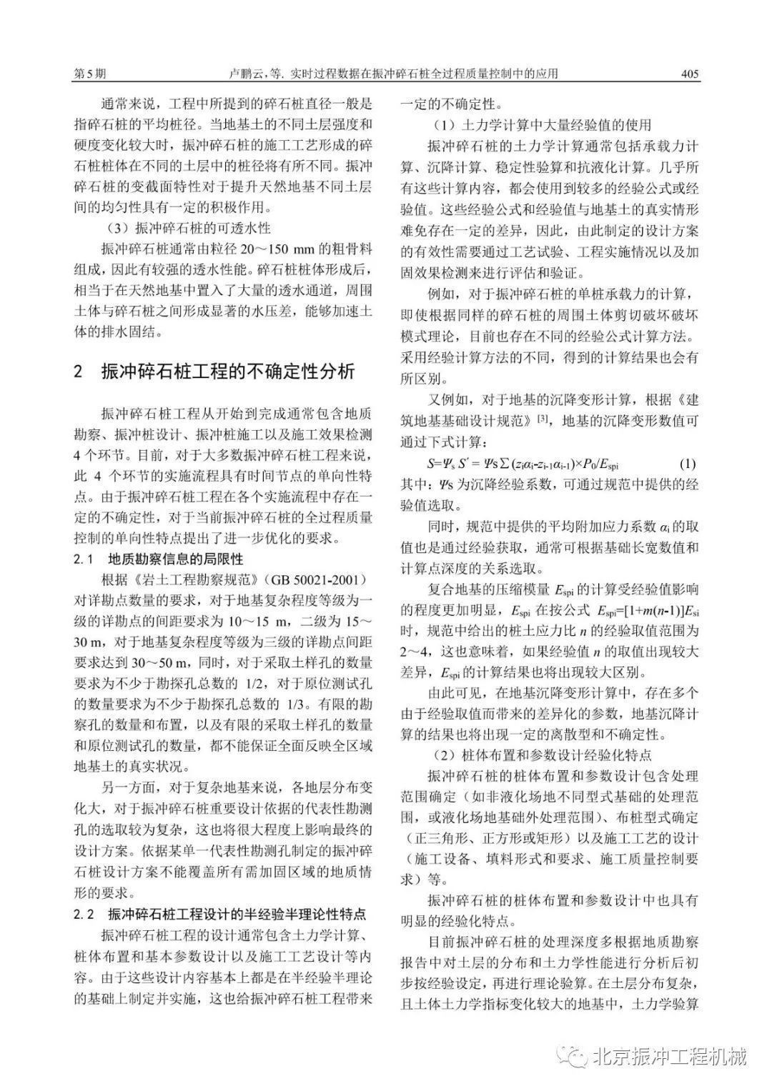 发表文章的内容主要是:结合岩土理论和工程实践,阐述了振冲碎石桩在岩土勘探、工程设计、碎石桩施工及效果检测等过程中 的不确定性,由此提出优化振冲碎石桩全过程质量控制的新思路。在此基础上,阐述了动态实时数据的获取对于 实现有效的振冲碎石桩全过程质量控制新思路的重要性,同时对影响振冲碎石桩工程质量的核心实时数据的分 类、作用以及应用进行了详细论述,以实现促进振冲碎石桩在地基加固工程中的理论和应用的发展的目的。